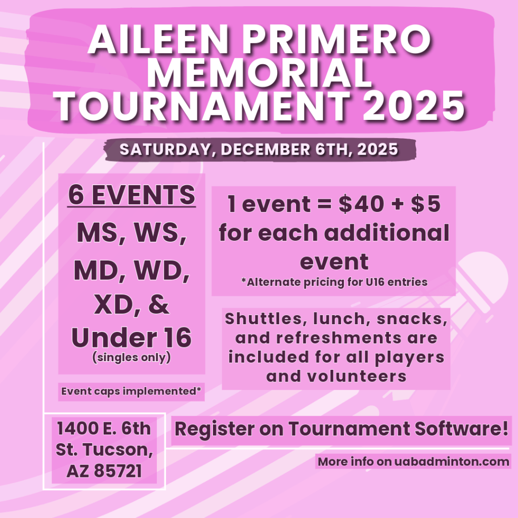 The University of Arizona Badminton Club is proud to announce our upcoming annual Aileen Primero Memorial Tournament!