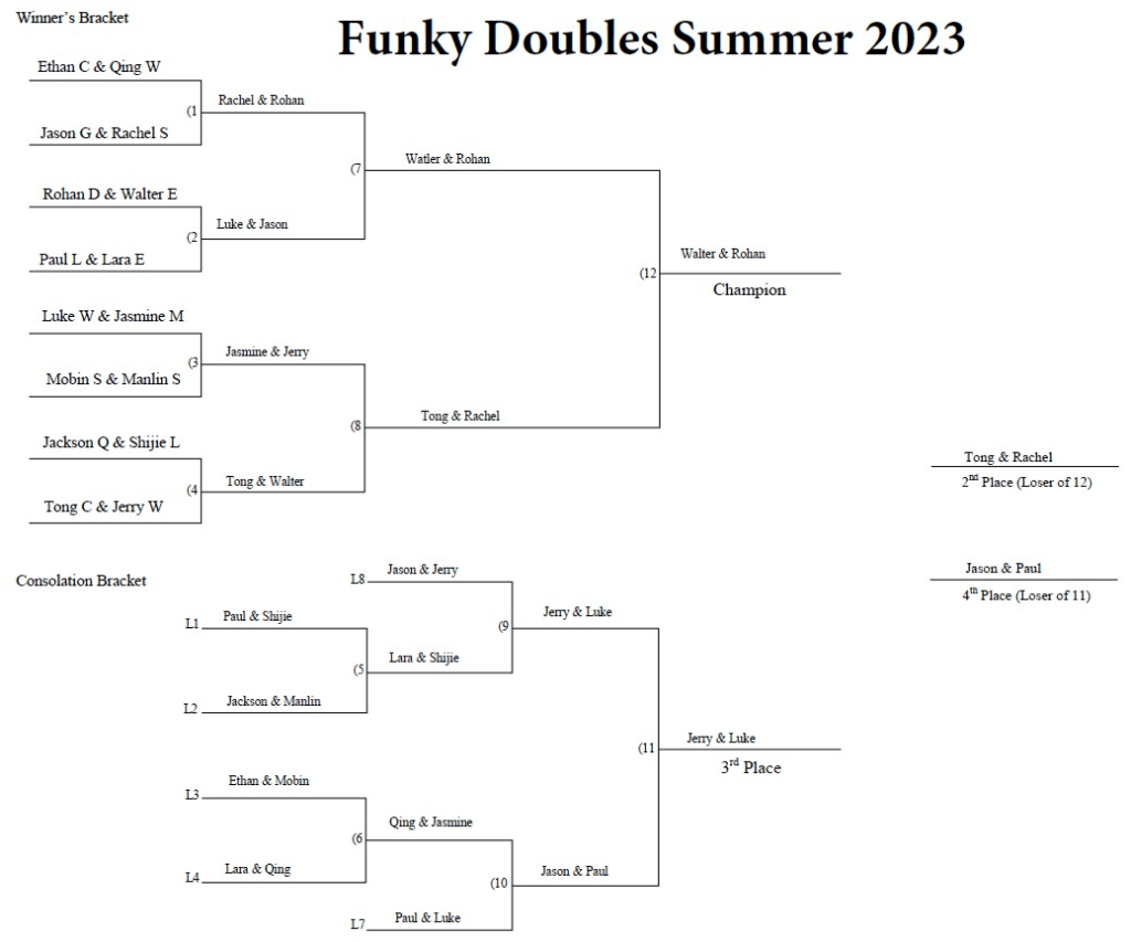 - FIRST-ROUND DRAWS: Partners are chosen using an online name generator that chooses 2 names at random. The bracket is then filled from top to bottom in the order of the names chosen. Matches are outlined through the bracket configuration after the first round is completely filled.