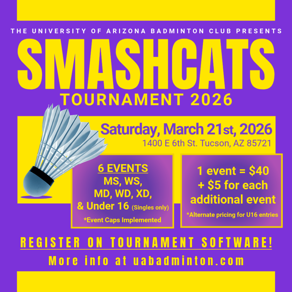 The University of Arizona Badminton Club is proud to announce our upcoming annual SmashCats Tournament!